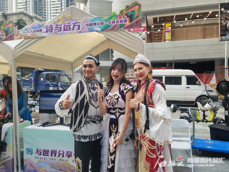 9月2日,“萬(wàn)人說(shuō)新疆”走進(jìn)廣東分享會(huì)之新疆特色文化主題“大巴扎”在廣州市越秀區(qū)289藝術(shù)創(chuàng)意園區(qū)北廣場(chǎng)舉行。廣州市民陳婕(中)穿著新疆民族服飾與舞蹈演員合影留念。石榴云/新疆日?qǐng)?bào)記者 甘興華攝