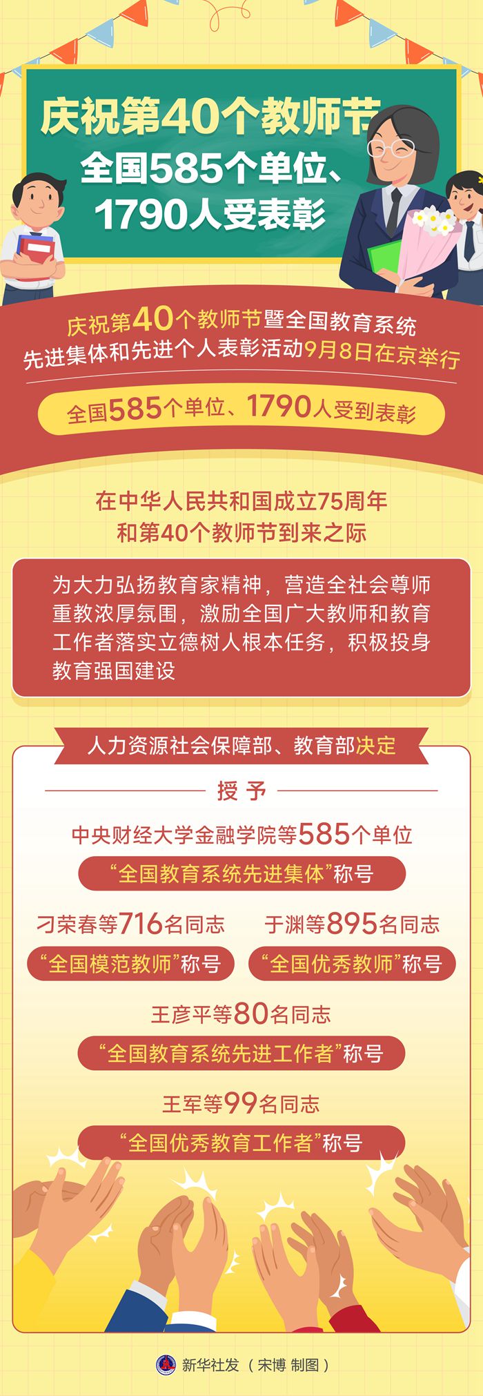 新華社北京9月8日電 慶祝第40個(gè)教師節(jié)暨全國(guó)教育系統(tǒng)先進(jìn)集體和先進(jìn)個(gè)人表彰活動(dòng)8日在京舉行。全國(guó)585個(gè)單位、1790人受到表彰。