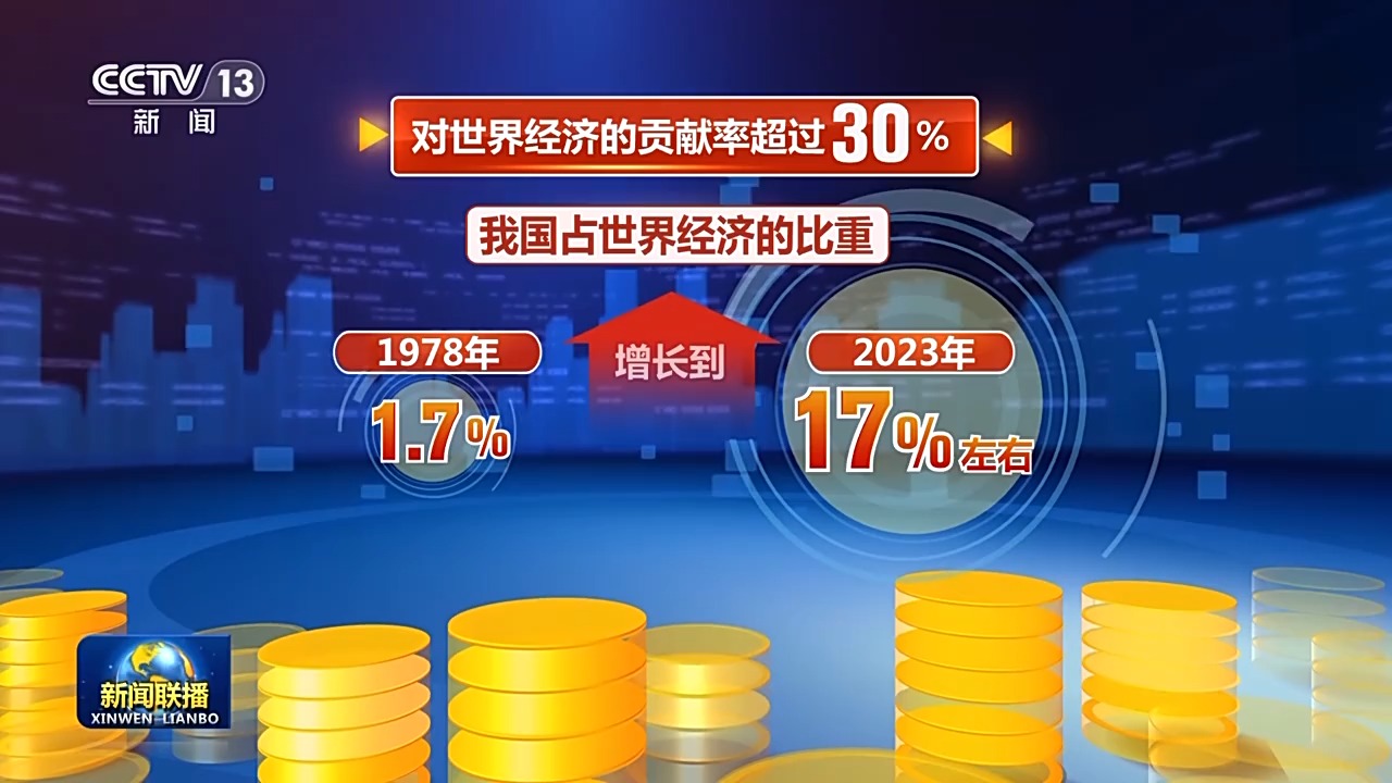 我國(guó)占世界經(jīng)濟(jì)的比重,從有數(shù)據(jù)統(tǒng)計(jì)以來(lái)的1978年的1.7%,增長(zhǎng)到2023年的17%左右,對(duì)世界經(jīng)濟(jì)的貢獻(xiàn)率超過30%。
