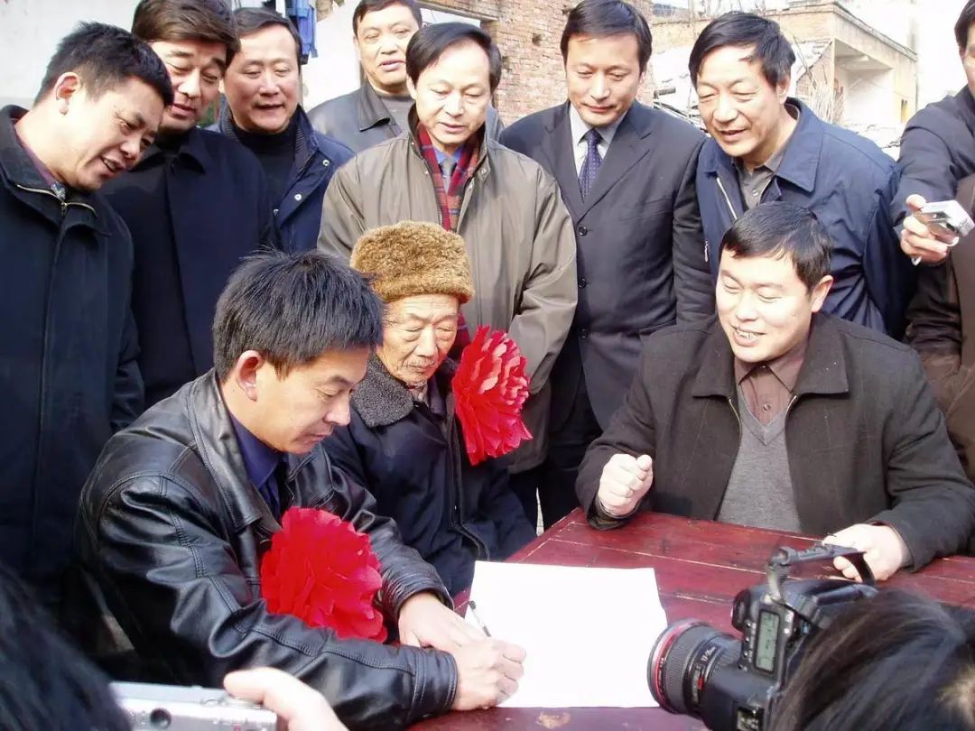 2005年1月5日,丹江口市三官殿辦事處馬灣村村民王瑞權(左一)與辦事處負責人簽訂搬遷合同,成為南水北調(diào)中線工程移民搬遷第一戶。(湖北日報通訊員 陳華平 攝)