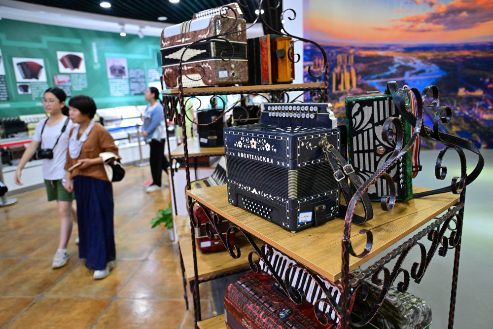 音樂舞蹈之所以在這里深受喜愛,與多民族文化在此深度交流交融密不可分。六星街上有一座亞歷山大手風(fēng)琴珍藏館,800多架來自俄羅斯、意大利、德國、捷克等國的精品手風(fēng)琴在此靜靜陳列,其中不乏手風(fēng)琴中的“古董”珍品。這些手風(fēng)琴的主人亞歷山大·謝爾蓋維奇·扎祖林是國家級非物質(zhì)文化遺產(chǎn)——俄羅斯族“巴揚(鍵鈕式手風(fēng)琴)藝術(shù)”非遺傳承人?!坝们俾曌層慰透惺艿搅墙值拿利愊楹褪俏业男脑浮!眮啔v山大說。