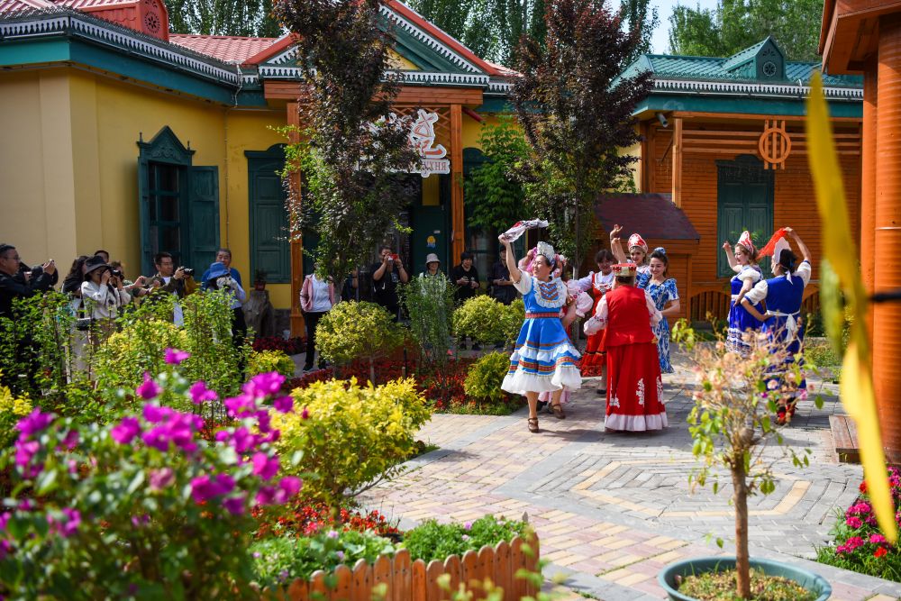 在新疆伊犁哈薩克自治州伊寧市六星街,當(dāng)?shù)鼐用裉鹞璧笟g迎遠方來客。新華社記者 丁磊 攝