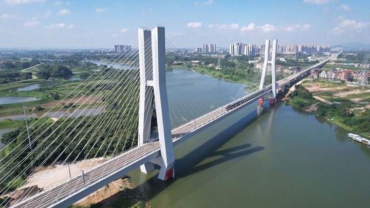 2023年9月26日,廣汕高鐵正式開通運營,列車經(jīng)過位于廣州市增城區(qū)的廣汕高鐵增江特大橋(無人機照片)。新華社記者 田建川 攝