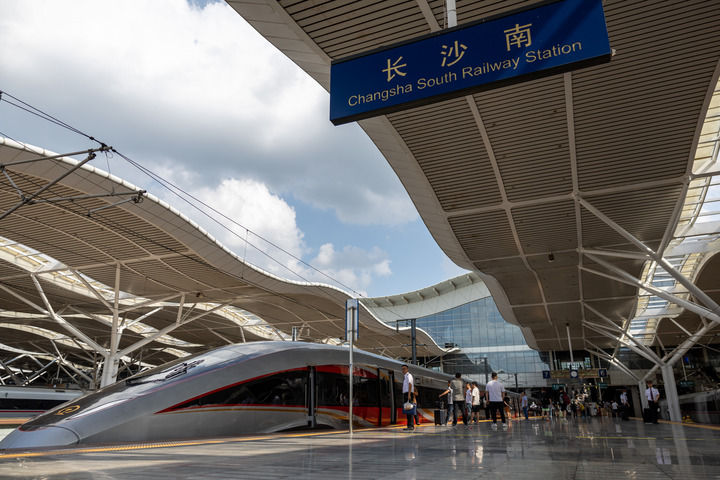 2024年6月15日,武漢至深圳北的G875次列車經(jīng)停長沙南站。當日,京廣高鐵武廣段復興號動車組列車按時速350公里高標運營,標志著京廣高鐵武漢至廣州段安全標準示范線全面建成,京廣高鐵全線實現(xiàn)復興號動車組列車按時速350公里高標運營。新華社記者 伍志尊 攝
