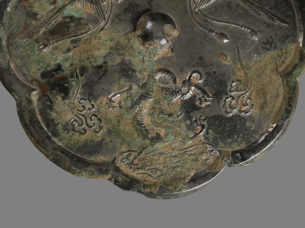 銅鏡呈八瓣葵花形,在中央的鏡鈕四周,自下而上分三個(gè)部分構(gòu)成了由水面到天空的立體空間。最下層為波光粼粼的一汪水面,雖然這一部分留存有因長(zhǎng)期埋藏地下而產(chǎn)生的銹跡,但仍依稀可辨碧波之上有一條昂首翹尾的龍。它四肢張開(kāi),龍尾反折向龍首上方并纏繞于一足之上,龍身兩側(cè)各一朵祥云,襯托出神龍騰躍翻飛的身姿。