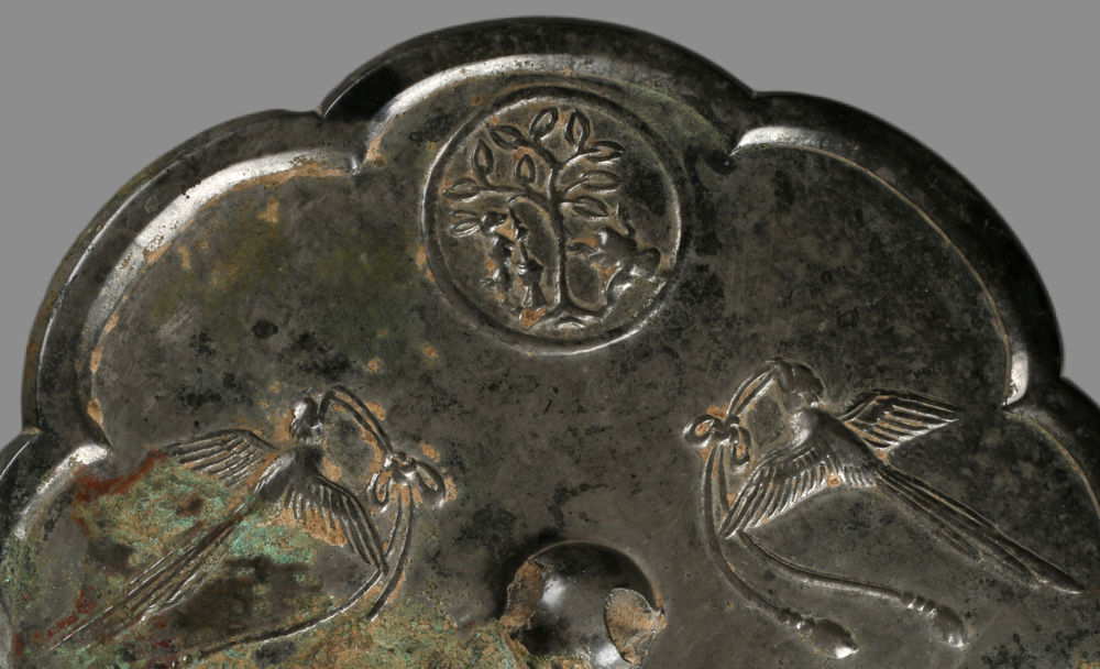 這枚雙鸞月宮紋葵花形鏡為國(guó)家二級(jí)文物,直徑15.3厘米,重0.54千克,1983年出土于陜西省東南部地區(qū)。陜西歷史博物館社會(huì)教育部主任、研究館員呼嘯說(shuō):“這枚銅鏡不過(guò)手掌大小,其畫(huà)面卻紋飾細(xì)膩、層次豐富?!?/p>