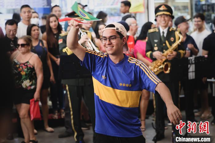 當《巴西水彩畫》《依帕內(nèi)瑪?shù)呐ⅰ返劝臀鳟數(shù)囟炷茉數(shù)臉非懫饡r,現(xiàn)場氛圍掀起一個高潮,熱情奔放的巴西民眾紛紛走進“舞臺”中央,跟著節(jié)奏扭起了巴西特色的桑巴舞,還有人情不自禁地哼起了歌曲。