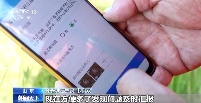 齊長城巡護(hù)員 韋良雙:如果沒有大風(fēng)大雨和極端惡劣天氣,我們都是每天來巡護(hù)一趟,每趟大約需要3至4個(gè)小時(shí)。如果發(fā)現(xiàn)自然災(zāi)害或者人為造成的損壞,我們會立即拍照上傳。原來的時(shí)候得在本子上登記,現(xiàn)在方便多了,發(fā)現(xiàn)問題及時(shí)匯報(bào)。
