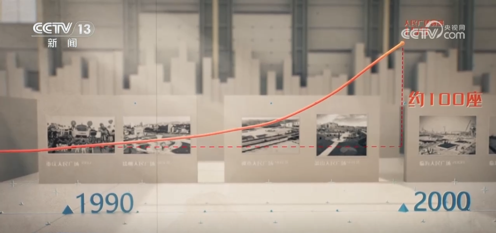 追溯歷史,將人民廣場(chǎng)的建設(shè)與時(shí)間線關(guān)聯(lián),我們發(fā)現(xiàn)了全國(guó)人民廣場(chǎng)建設(shè)的兩個(gè)重要時(shí)間節(jié)點(diǎn):在90年代,隨著城鎮(zhèn)化的步伐,更多的廣場(chǎng)滿足了人們對(duì)公共空間的新需求,大約有100座人民廣場(chǎng)在這十年間建成。2013年左右,一股新的建設(shè)浪潮出現(xiàn)在小型縣城,尤其是在剛剛擺脫貧困的地區(qū)興起,人民廣場(chǎng)的增量又與脫貧攻堅(jiān)的進(jìn)程同步見證了一塊塊土地從貧瘠到繁榮的動(dòng)人變遷。