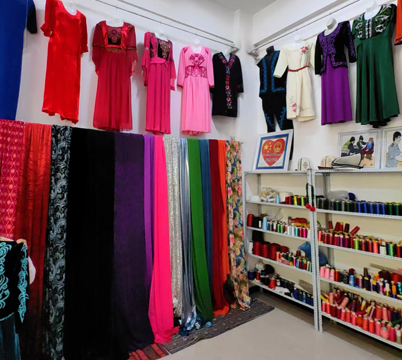 托云牧場積極鞏固政策支持,集中力量打造項目驅(qū)動,有效推進(jìn)地方產(chǎn)業(yè)集群的全面發(fā)展,實現(xiàn)經(jīng)營集約化與產(chǎn)業(yè)高效整合。2015年,由牧場“刺繡巧匠”吐孔·沙熱牽頭并成功注冊了“托云牧場帕米爾刺繡”合作社。到了2019年,牧場成功申請到160萬元援疆資金,用于建設(shè)新的手工刺繡產(chǎn)品生產(chǎn)基地。在吐孔·沙熱的帶動下,合作社目前擁有60名成員,其中43名技藝嫻熟的繡工,年總收入攀升至三十萬。該合作社通過直銷、與克州百來思服裝店的業(yè)務(wù)合作,以及接受附近學(xué)校的校服訂單等多種渠道,將其生產(chǎn)的床品、家居布藝、女性服裝及校服推向阿圖什市、烏恰縣等地區(qū)市場。