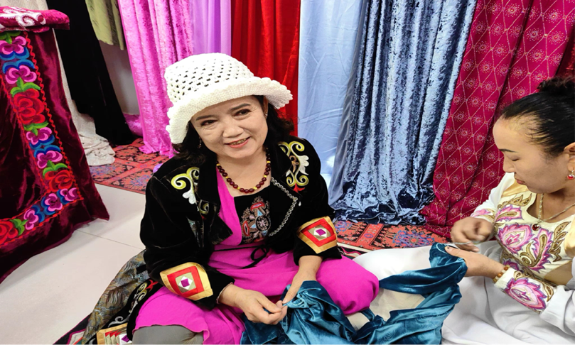 將傳統(tǒng)手工藝轉(zhuǎn)化為商品,市場化推進(jìn),托云牧場不懈探索手工藝與鄉(xiāng)村振興的新路徑,助力當(dāng)?shù)厥止に嚾藢ⅰ爸讣饧妓嚒鞭D(zhuǎn)化為“指尖經(jīng)濟(jì)”。維吾爾族姑娘努力曼古麗·買加買提分享道:“在刺繡合作社,我與柯爾克孜族的姐妹互相切磋學(xué)習(xí),通過刺繡工藝的差異,我們發(fā)現(xiàn)了各民族刺繡的獨特風(fēng)格,同時發(fā)現(xiàn)很多共通的地方。在彼此互相了解學(xué)習(xí)的過程中,感受到了各民族文化的相互交融與共同進(jìn)步?!?/p>