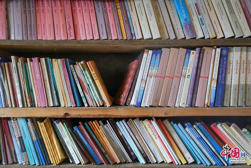 扎西達(dá)杰介紹藏書(shū)。中國(guó)網(wǎng)記者鄭偉攝