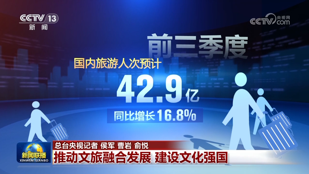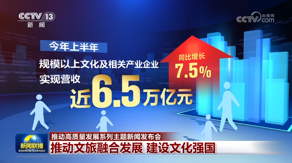 今年上半年,規(guī)模以上文化及相關(guān)產(chǎn)業(yè)企業(yè)實現(xiàn)營收近6.5萬億元,同比增長7.5%;前三季度,國內(nèi)旅游人次預(yù)計達42.9億,同比增長16.8%;入境旅游人次預(yù)計達0.95億,同比增長55.4%,更多外國民眾來華旅游,體驗賓至如歸、感受美好中國。