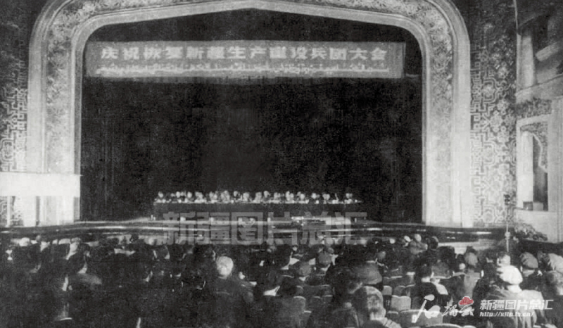 1982年6月1日,慶?;謴?fù)新疆生產(chǎn)建設(shè)兵團(tuán)大會(huì)在烏魯木齊舉行。新疆圖片總匯資料圖片