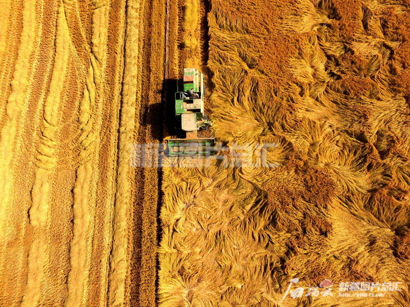 2016年10月11日,新疆生產(chǎn)建設(shè)兵團(tuán)第一師原阿拉爾農(nóng)場職工在收割水稻。王志清攝