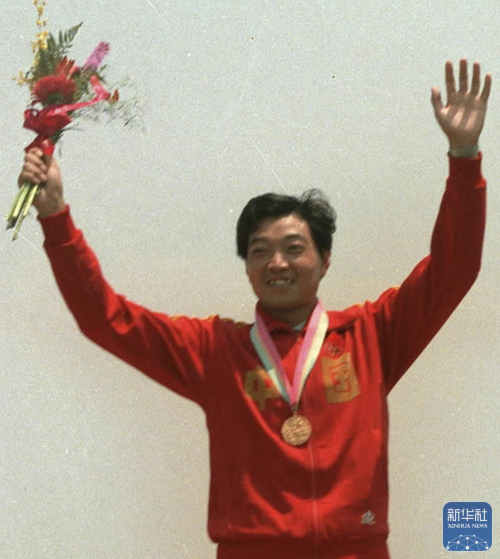 1984年洛杉磯奧運(yùn)會上,許海峰在獲得男子自選手槍項(xiàng)目冠軍后領(lǐng)獎(jiǎng)(資料照片)。 新華社發(fā)