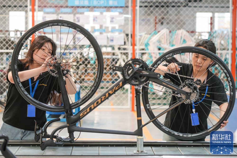 2024年7月8日,在山東泰山瑞豹復(fù)合材料有限公司生產(chǎn)車間,工人在組裝碳纖維自行車。位于山東樂陵經(jīng)濟(jì)開發(fā)區(qū)的泰山體育產(chǎn)業(yè)集團(tuán)為2024巴黎奧運(yùn)會的摔跤、自行車、跆拳道、體操、田徑等比賽提供器材。新華社記者 朱崢攝