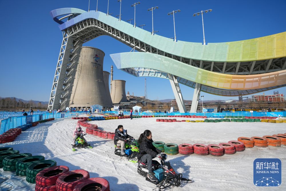 游客在首鋼滑雪大跳臺下的“首鋼園冰雪匯”體驗(yàn)雪上游樂項(xiàng)目(2023年1月31日攝)。 新華社記者 鞠煥宗 攝