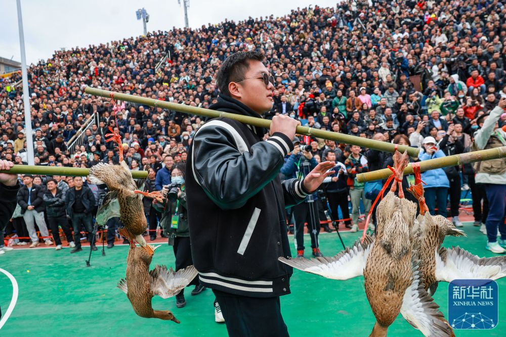 2023年3月27日,村民挑著當(dāng)?shù)剞r(nóng)特產(chǎn)品“三穗麻鴨”進(jìn)入賽場。這是季軍銅仁市代表隊(duì)的獎(jiǎng)品。 當(dāng)日,貴州省首屆“美麗鄉(xiāng)村”籃球聯(lián)賽總決賽在黔東南州臺江縣臺盤村舉行。新華社記者 歐東衢 攝