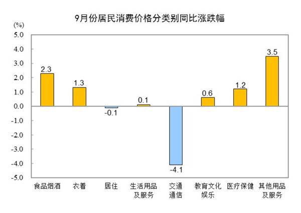 9月份,全國居民消費(fèi)價(jià)格環(huán)比持平。其中,城市下降0.1%,農(nóng)村上漲0.1%;食品價(jià)格上漲0.8%,非食品價(jià)格下降0.2%;消費(fèi)品價(jià)格上漲0.2%,服務(wù)價(jià)格下降0.3%。