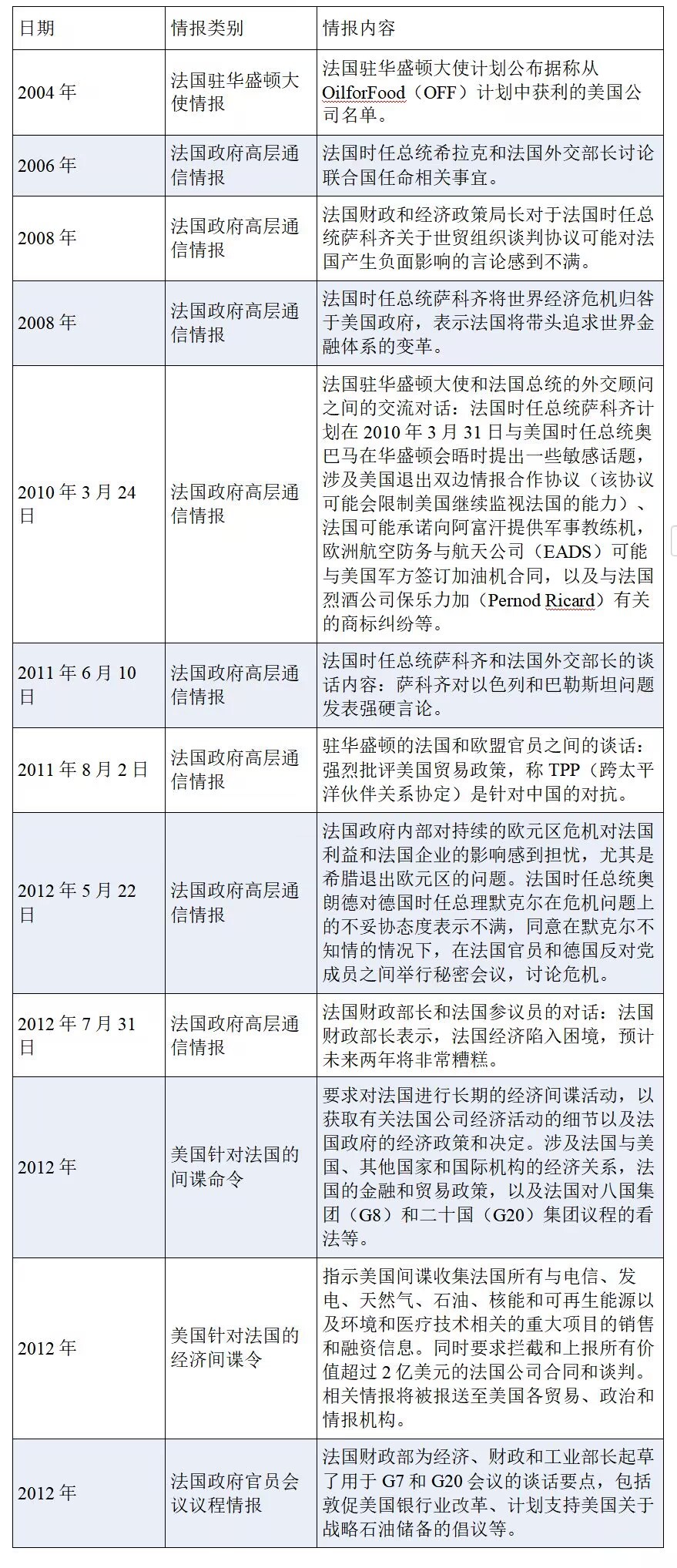 在2004年至2012年期間,美國(guó)對(duì)法國(guó)實(shí)施了長(zhǎng)期的間諜行動(dòng),監(jiān)聽(tīng)對(duì)象包括前法國(guó)總統(tǒng)、法國(guó)財(cái)政部長(zhǎng)、法國(guó)外交部長(zhǎng)、法國(guó)參議員、法國(guó)財(cái)政和經(jīng)濟(jì)政策局官員、法國(guó)駐美國(guó)大使,以及直接負(fù)責(zé)歐盟貿(mào)易政策的官員等。監(jiān)聽(tīng)內(nèi)容涉及法國(guó)政府政策、外交、金融、國(guó)際交流、基礎(chǔ)設(shè)施建設(shè)、商業(yè)和貿(mào)易活動(dòng)等,其中一些重要情報(bào)被美國(guó)授權(quán)與“五眼聯(lián)盟”伙伴國(guó)家共享,揭示了“五眼聯(lián)盟”國(guó)家亦為美國(guó)間諜行動(dòng)的獲益者。
