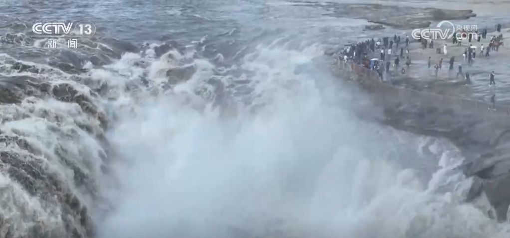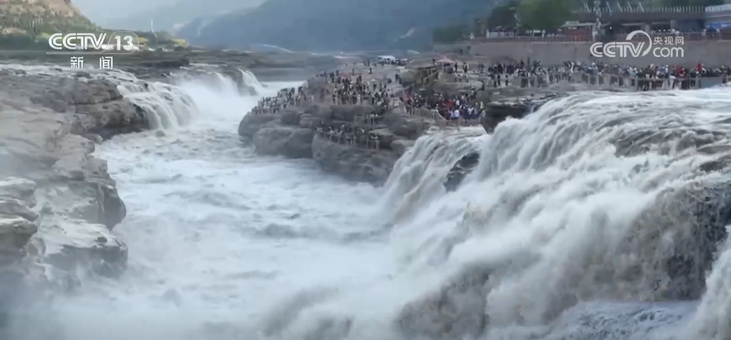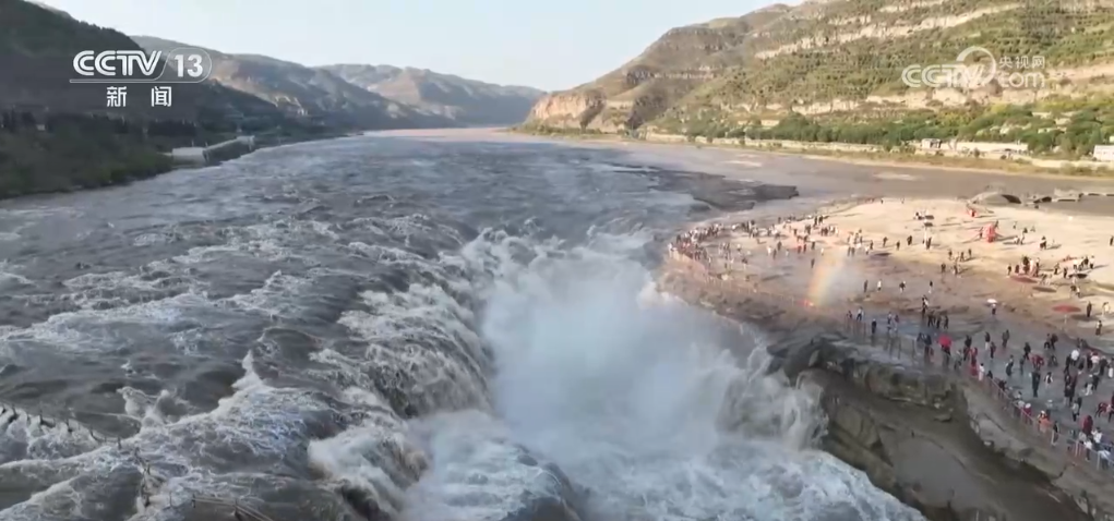 連日來,受上游水庫調(diào)節(jié)放水影響,位于山西吉縣和陜西宜川縣交界的黃河壺口瀑布水量豐沛。從空中俯瞰,黃河流經(jīng)晉陜峽谷到達壺口,水面由三四百米寬驟然收縮為50多米,再墜入“十里龍槽”,濺起數(shù)十米高的水霧,氣勢磅礴。據(jù)了解,黃河壺口段目前正處于秋汛期,最大水流量約為1300立方米/秒,是日常水流量的3倍,主瀑與副瀑連成一片,呈現(xiàn)出一條線狀,場面壯觀。進入10月份以來,黃河壺口瀑布景區(qū)日均接待游客超過2萬人次。