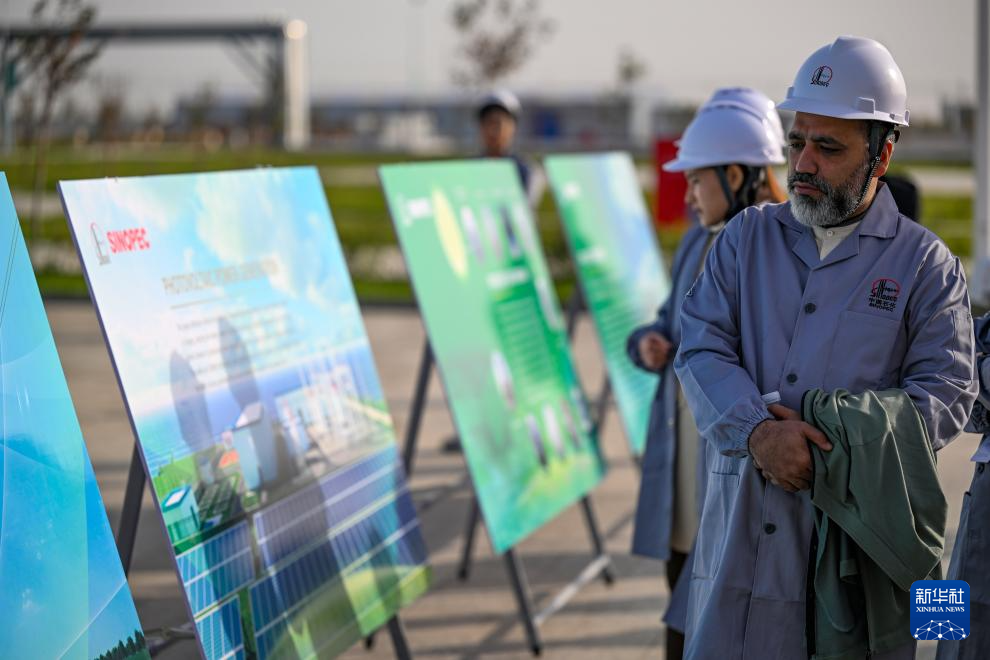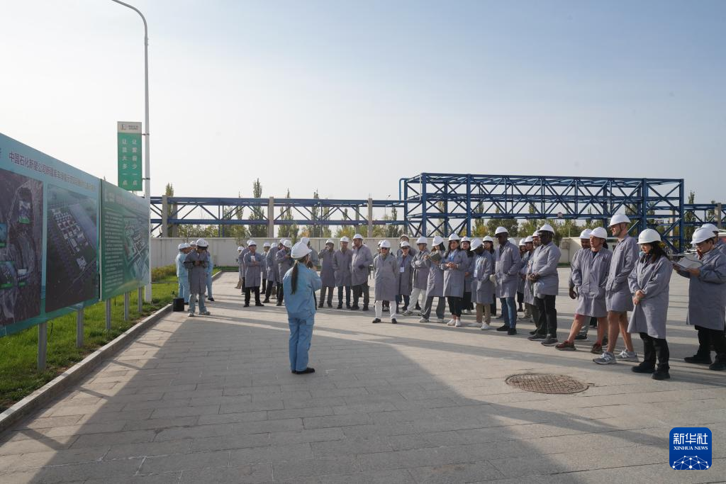 10月16日,嘉賓在中國(guó)石化新疆庫(kù)車綠氫示范項(xiàng)目參觀。新華社記者 劉夢(mèng)琪 攝
