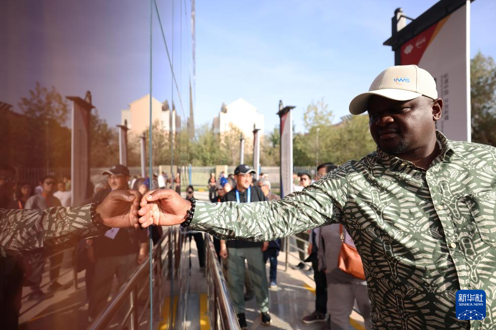10月15日,嘉賓觸摸吐魯番光伏電站中控大樓外墻光伏板。新華社記者 李明 攝