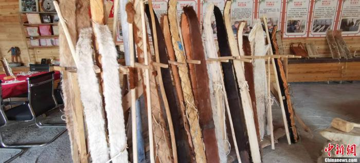 圖為斯蘭別克·沙合什工坊里的毛皮滑雪板。(記者 郎朗 攝)