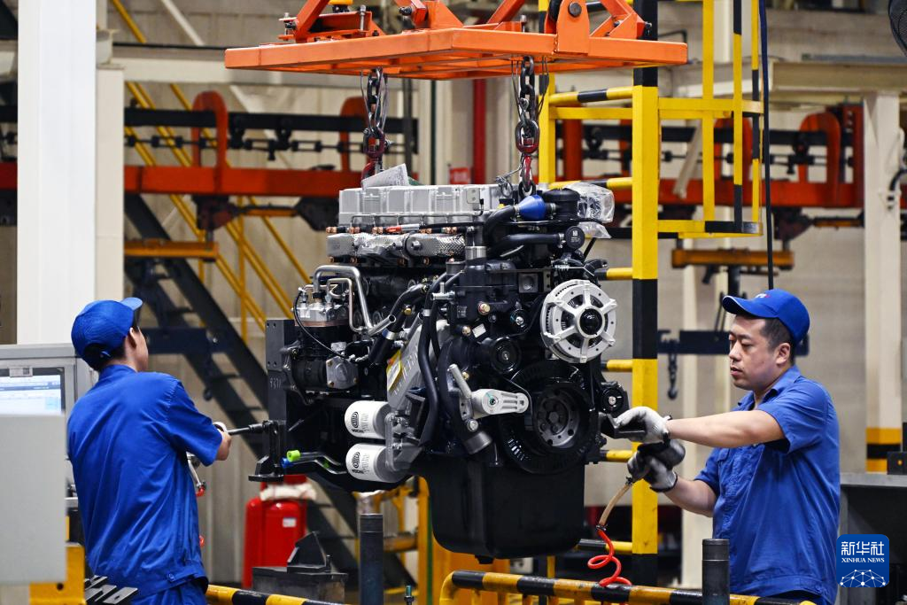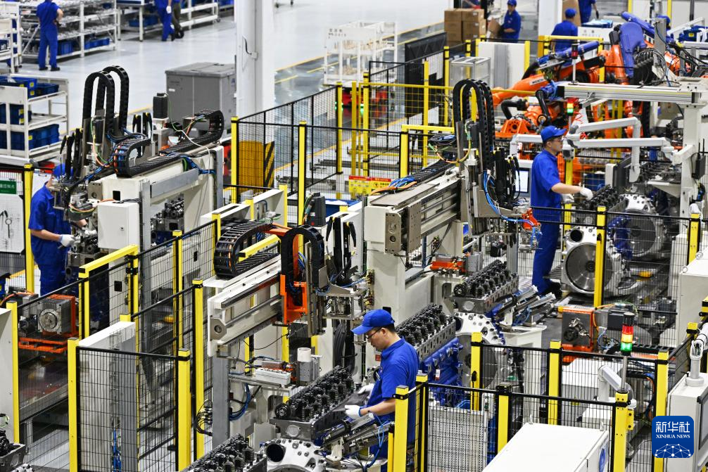 在濰柴集團(tuán)車(chē)間內(nèi),工人在裝配發(fā)動(dòng)機(jī)(8月21日攝)。新華社記者 李紫恒 攝