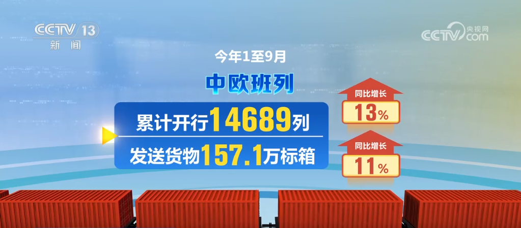 數(shù)據(jù)顯示,今年1至9月,中歐班列累計(jì)開(kāi)行14689列,發(fā)送貨物157.1萬(wàn)標(biāo)箱,同比分別增長(zhǎng)13%、11%。其中9月份開(kāi)行1633列,發(fā)送貨物17.1萬(wàn)標(biāo)箱,同比分別增長(zhǎng)15%、12%。