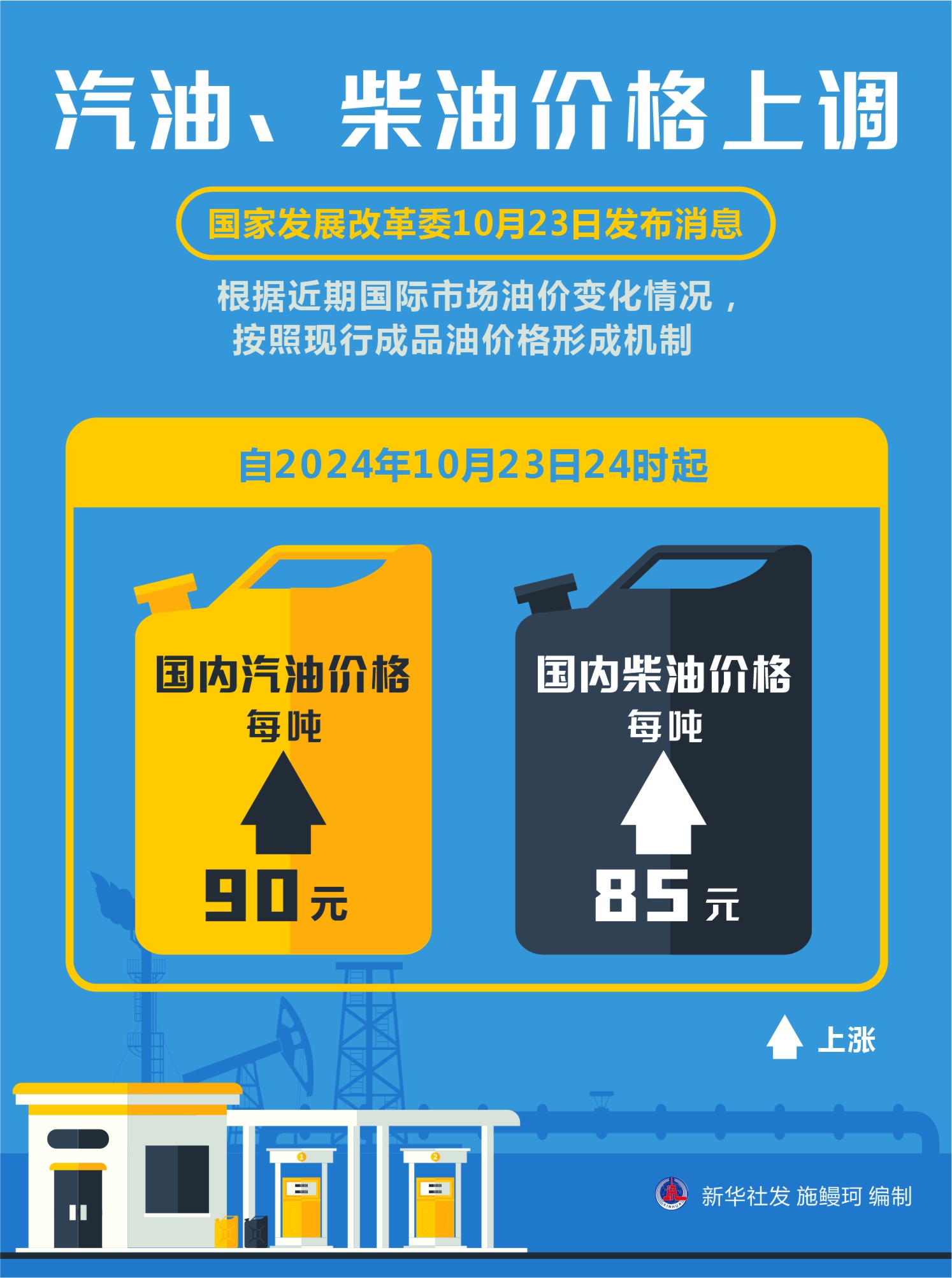 國家發(fā)展改革委23日發(fā)布消息,根據(jù)近期國際市場油價變化情況,按照現(xiàn)行成品油價格形成機制,自2024年10月23日24時起,國內(nèi)汽、柴油價格每噸分別上漲90元和85元。