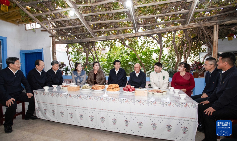 10月21日至24日,中共中央政治局常委、全國政協(xié)主席王滬寧在新疆和田、喀什調(diào)研。這是23日下午,王滬寧在疏勒縣塔孜洪鄉(xiāng)臺(tái)吐爾村同干部群眾交流。新華社記者 李濤 攝