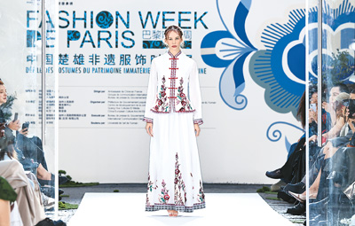 模特在法國(guó)巴黎舉行的中國(guó)楚雄非遺服飾時(shí)裝展上展示時(shí)裝。