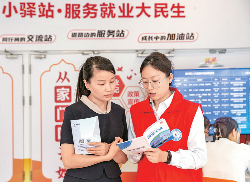 零工市場是向靈活就業(yè)人員與用工主體提供就業(yè)服務的重要載體。圖為2024年9月3日,江蘇省南通市通州區(qū)萬達廣場“零工驛站”內(nèi),就業(yè)服務人員在向求職者介紹就業(yè)創(chuàng)業(yè)政策。人民圖片 翟慧勇/攝