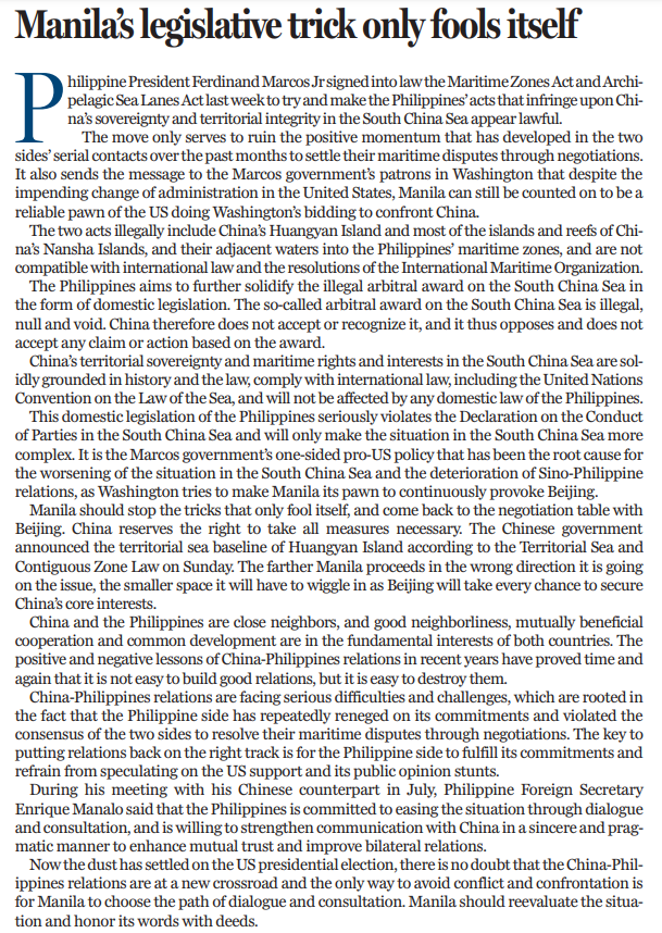 菲律賓總統(tǒng)馬科斯日前簽署“群島海道法”和“海洋區(qū)域法”,試圖“洗白”菲律賓在南海侵犯中國主權和領土完整的行為。