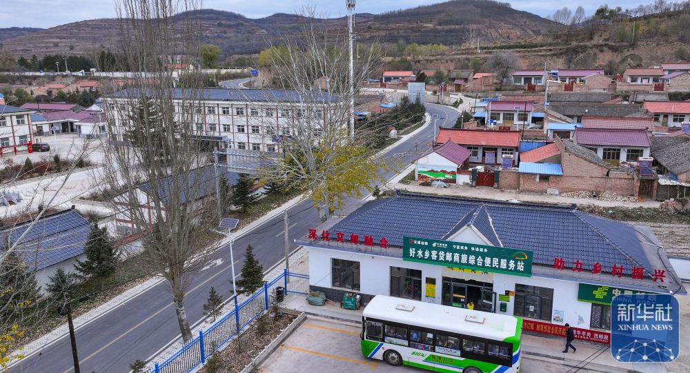 載有快遞物品的城鄉(xiāng)公交車即將從隆德縣公交公司駛出(11月9日攝,無人機(jī)照片)。