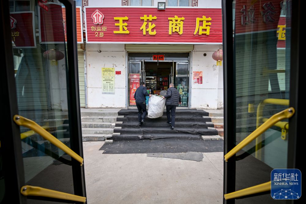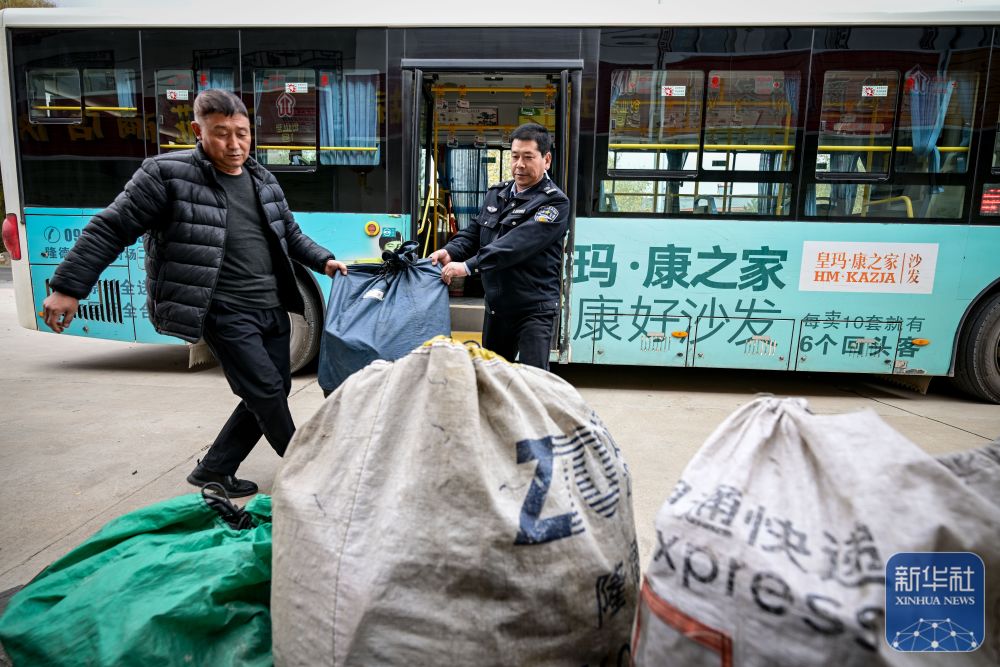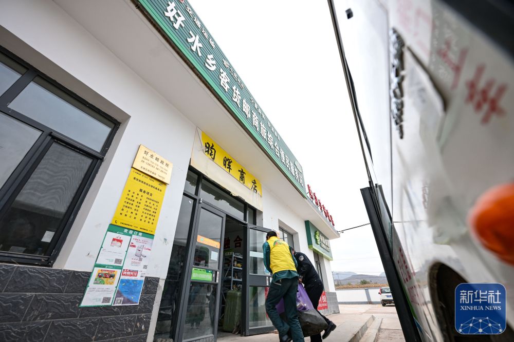 11月9日,隆德縣公交車司機(jī)和好水鄉(xiāng)客貨郵商旅綜合便民服務(wù)站經(jīng)營者從公交車上卸下快遞物品。