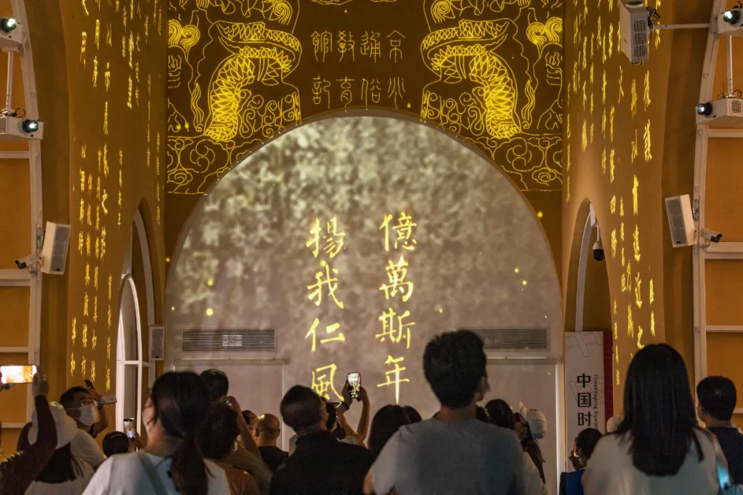 作為北京中軸線15處遺產(chǎn)構(gòu)成要素之一,鐘鼓樓于2019年啟動文物修繕及展示提升工作,該工作被納入《北京中軸線申遺保護(hù)三年行動計劃》。記者步入鼓樓一層,各券洞相互連通、明亮開敞。徜徉其中,展覽“時間的故事”回溯著鐘鼓樓和北京中軸線保護(hù)傳承的故事。忽見遮光簾落下、光影秀開場,觀眾皆循響起的音樂匯聚到展廳中央,或舉起相機,或靜靜欣賞。吊裝在兩旁白色拱形鋼結(jié)構(gòu)下的投影儀投射出萬道光線,讓觀眾在光影變幻間走進(jìn)那段“暮鼓晨鐘”的歷史記憶。