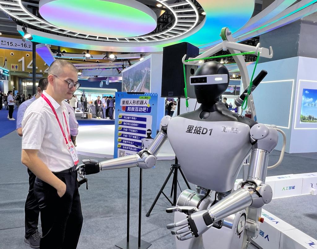 圖為“里掂人形機(jī)器人”和觀眾交流互動(dòng)。新華社發(fā)(李俊豪 攝)
