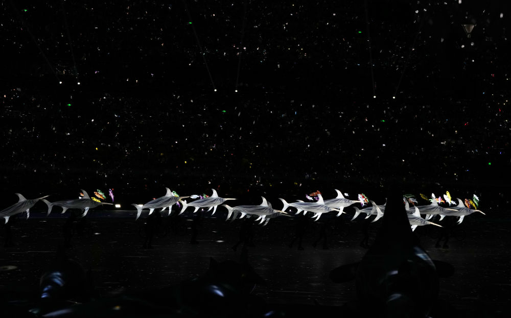 在全場(chǎng)觀眾“哇”的一聲驚嘆中,整座體育場(chǎng)化身星辰大海。騎自行車、滑輪滑、腳踩平衡車的演員們手舉海龜、鯊魚、海豚等形象魚貫而入,讓觀眾如置海底。隨后,高鐵飛馳、深海探測(cè)、火箭發(fā)射、太空行走等畫面在星海中逐一呈現(xiàn),展現(xiàn)了我國(guó)在高科技領(lǐng)域的發(fā)展成就,帶來(lái)生動(dòng)的沉浸式體驗(yàn)。