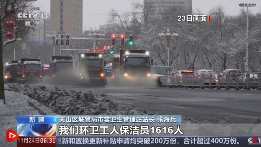 11月22日下午到11月23日16時(shí),烏魯木齊迎來降雪,最大積雪深度達(dá)20厘米。城管部門連夜作業(yè),快速出動大型清雪車輛和環(huán)衛(wèi)工人進(jìn)行清雪。