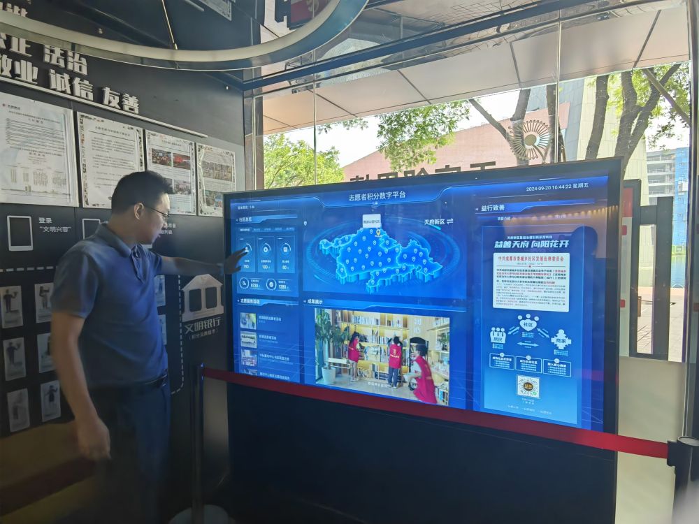 麓湖公園社區(qū)工作人員在介紹志愿者積分?jǐn)?shù)字平臺(tái)。新華社記者董小紅 攝