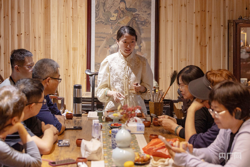 在倒扒獅街,“90后”安慶姑娘秦?zé)o顏是一家文化主題會館的主理人。在她的會館里,檀木、玉石等制作而成的新中式文玩飾品、傳統(tǒng)工藝面料制作而成的“新中式”服裝、古色古香的“新中式”茶館,定期舉行的雅集活動……無一不體現(xiàn)著獨特的東方美學(xué)。2020年,在上海從事珠寶設(shè)計工作的她返回家鄉(xiāng)經(jīng)營起這家文化空間?!凹戎鹦?,也尋根?!彼M腿藖淼竭@里,放慢腳步,在交流與體驗中感受傳統(tǒng)文化的魅力,豐富精神體驗。