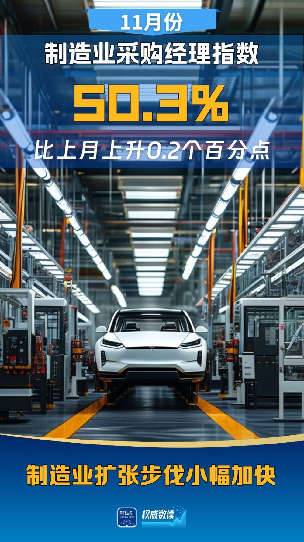 國家統(tǒng)計局30日發(fā)布中國采購經(jīng)理指數(shù)。11月份,隨著一系列存量政策和增量政策持續(xù)協(xié)同發(fā)力,制造業(yè)PMI在景氣區(qū)間上行,升至50.3%,擴張步伐有所加快;非制造業(yè)商務活動指數(shù)為50.0%,比上月下降0.2個百分點,位于臨界點;綜合PMI產出指數(shù)為50.8%,與上月持平,表明我國企業(yè)生產經(jīng)營活動總體繼續(xù)擴張。