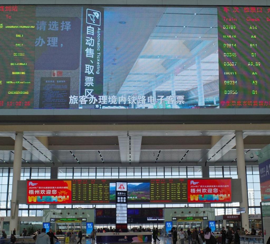 12月1日,在廣西南寧市南寧東站,記者看到車站大屏幕上,鐵路電子客票服務(wù)宣傳片正在滾動播放。