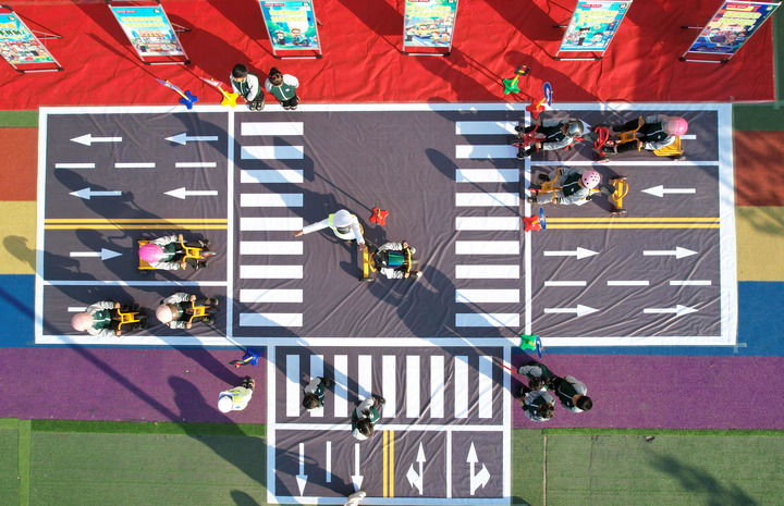 12月1日,在山東省臨沂市沂南縣雙堠鎮(zhèn)中心幼兒園,孩子們通過(guò)趣味游戲的方式學(xué)習(xí)交通知識(shí)(無(wú)人機(jī)照片)。新華社發(fā)(王彥冰攝)