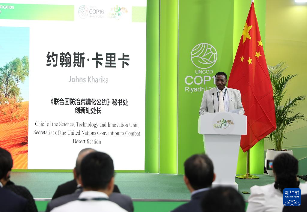 12月4日,在沙特阿拉伯利雅得《聯(lián)合國(guó)防治荒漠化公約》第十六次締約方大會(huì)(COP16)中國(guó)館,《公約》秘書(shū)處創(chuàng)新處處長(zhǎng)約翰斯·卡里卡在邊會(huì)上發(fā)言。新華社記者 王東震 攝