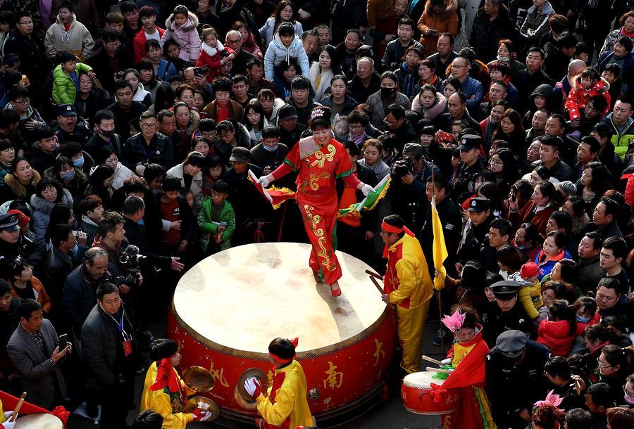 2018年3月2日,一支鑼鼓隊(duì)在河南浚縣古廟會(huì)上表演。 新華社記者 李安 攝