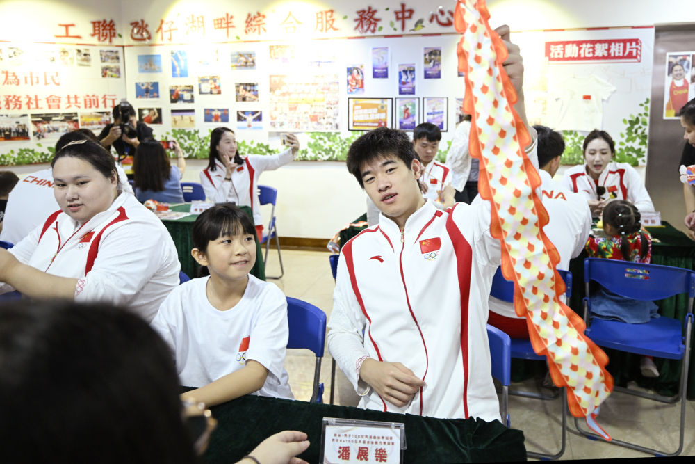 9月2日,在澳門(mén)工聯(lián)氹仔湖畔綜合服務(wù)中心,游泳運(yùn)動(dòng)員潘展樂(lè)(右)展示與小朋友一起制作的燈籠。新華社發(fā)